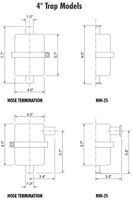 A 4″ stainless steel high vacuum trap with NW25 flange connections set at a right angle configuration. Includes one filter element (see element choices below). Traps also come in a straight through design. Also available with hose terminations.